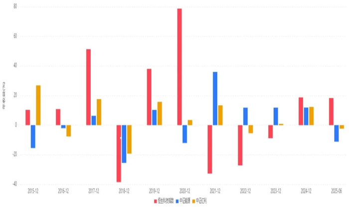 恒生科技指数、中证红利指数、中证能源指数2015-2025年年度收益