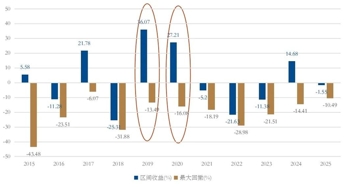 沪深300指数2015-2025年年度收益与最大回撤