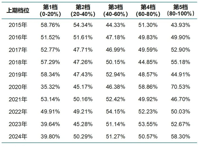 依据公募主观权益类基金每年的年度排名由高到低将基金均分为5档,计算各档基金在下一年度的平均排名百分位,例如2015年第1档基金(排名前20%分位)在下一年(2016年)的平均排名百分位仅为51.62%。