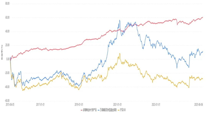 即使投资者恰好于2015年沪深300高点买入偏股混合型基金(下图蓝线),并持有至今投后累计收益为11.92%,同期沪深300指数(下图黄线)收益为-27.64%。而同期买入多策略组合(下图红线),波动大幅降低,持有体验明显改善。