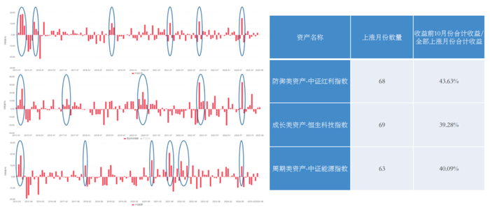 回看过去十年,不同的经济周期中有不同风格指数的收益机会,并且从月度收益分布来看,单一指数上涨的月份约占全部126个统计月份的1/2,而在上涨的月份里,收益前10月份所贡献的收益约占全部收益的40%。