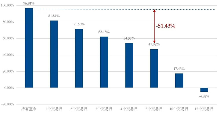 ◆ 错过涨幅最大的5个交易日,累计收益就减少了51.43%;