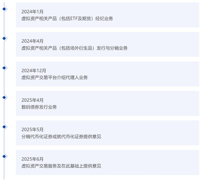 2024年,国泰君安国际在香港市场率先推出以虚拟资产现货ETF为基础的结构性产品,并获香港证监会许可,开展虚拟资产交易平台介绍代理人业务。2025年上半年,国泰君安国际获香港证监会确认,可向客户分销代币化证券或就代币化证券提供意见,并启动了数码债券发行业务。