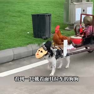 一只小狗戴着面具拉着小车