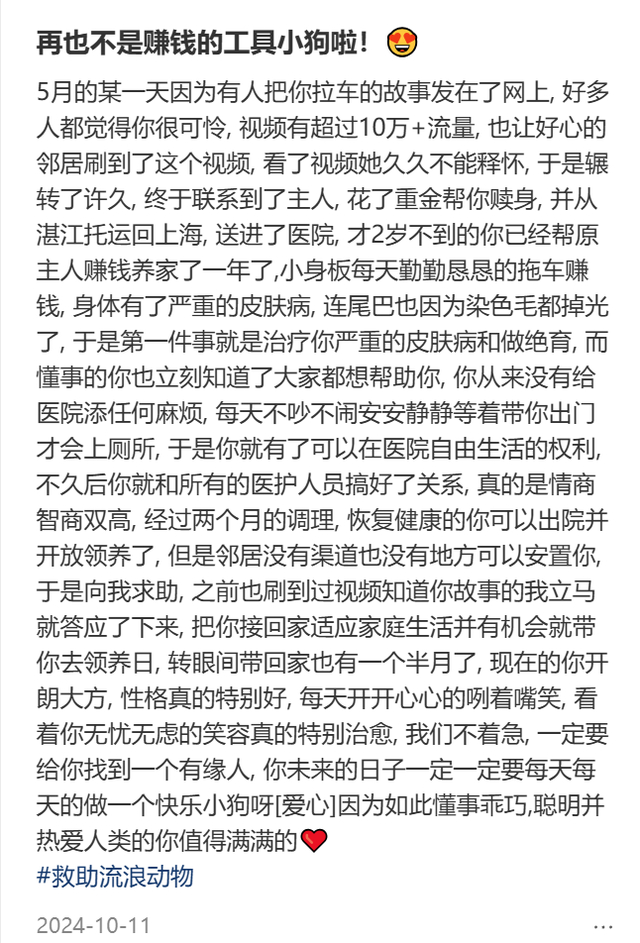 “辗转了许久,终于联系到了主人,花了重金帮你赎身,并从湛江托运回上海,送进了医院。才2岁不到的你已经帮原主人赚钱养家了一年了,小身板每天勤勤恳恳的拖车赚钱,身体有了严重的皮肤病,连尾巴也因为染色毛都掉光了。于是第一件事就是治疗你严重的皮肤病和做绝育,而懂事的你也立刻知道了大家都想帮助你,你从来没有给医院添任何麻烦……经过两个月的调理,恢复健康的你可以出院并开放领养了……”