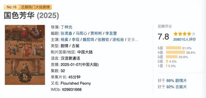 另一方面,口碑层面,高分段选手同样缺失。豆瓣数据显示,上半年8分阵营的古装剧只有《鹊刀门传奇2》,打分人数只有3万;打分人数超35万,豆瓣评分7.8分的《国色芳华》,算上半年整体表现最好的一部;《藏海传》最终拿下了47万人打分、豆瓣7.1的成绩。