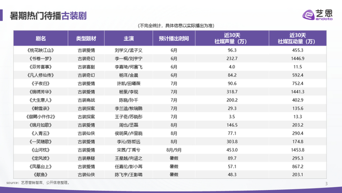 据娱乐独角兽不完全统计,今年上半年各平台共上线了23部古装剧,包揽了仙侠、权谋、商战、喜剧等多类型题材。艺恩报告显示,暑期档热门待播古装剧还有16部,其中不乏《锦绣芳华》《凡人修仙传》等颇受期待的作品。