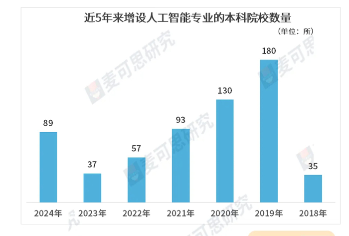 麦可思2025年就业蓝皮书显示,人工智能(6546元)已进入2024届本科生毕业半年后的月收入排名前50位的专业。人工智能属于高度知识密集型产业,对人才综合胜任力、创新能力要求更高,岗位更多需要从业者具有研究生学历背景。麦可思2024年就业蓝皮书研究发现,计算机类专业近三年应届本科毕业生直接从事“人工智能工程技术人员”职业的比例(0.3%)较低;毕业五年后从事该职业的比例达到1.5%,其中获得研究生学历的占比接近八成(78%)。基于某一流大学硕士人工智能专业生源特点来看,优质本科(一流大学)生源占七成以上。