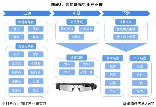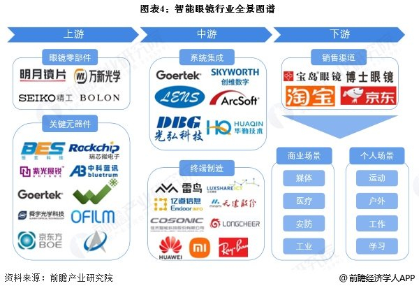 智能眼镜产业链的上游为眼镜零部件以及关键元器件;中游为系统集成以及终端制造;下游主要为不同智能眼镜的销售渠道以及应用场景。