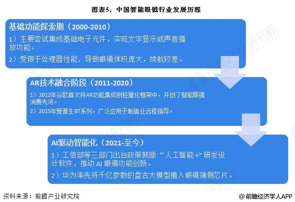 中国智能眼镜行业发展主要经历三个阶段,分别为基础功能探索期、AR技术融合期以及目前的AI驱动智能化时期。随着我国信息技术的进步和发展,“人工智能+”成为未来消费电子行业发展的主旋律,以华为为代表的我国智能眼镜研发、生产企业正在积极探索如何将人工智能更好的应用于智能眼镜中,进一步提高产品的智能化水平。