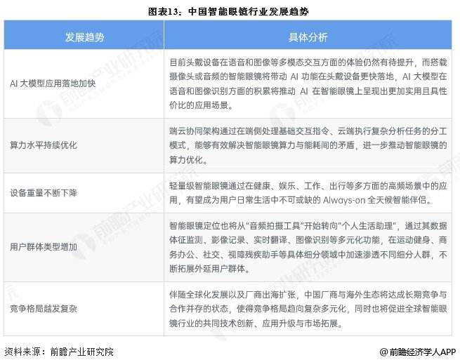 AI技术的快速进步为中国智能眼镜行业的发展提供了极强的动力,未来AI功能在智能眼镜的应用将更快落地,推动智能眼镜的需求不断增加,带动算力水平提升、重量持续下降、用户群体增加。此外,需求增加也将带来更多玩家入局该行业,使得竞争格局越发复杂。