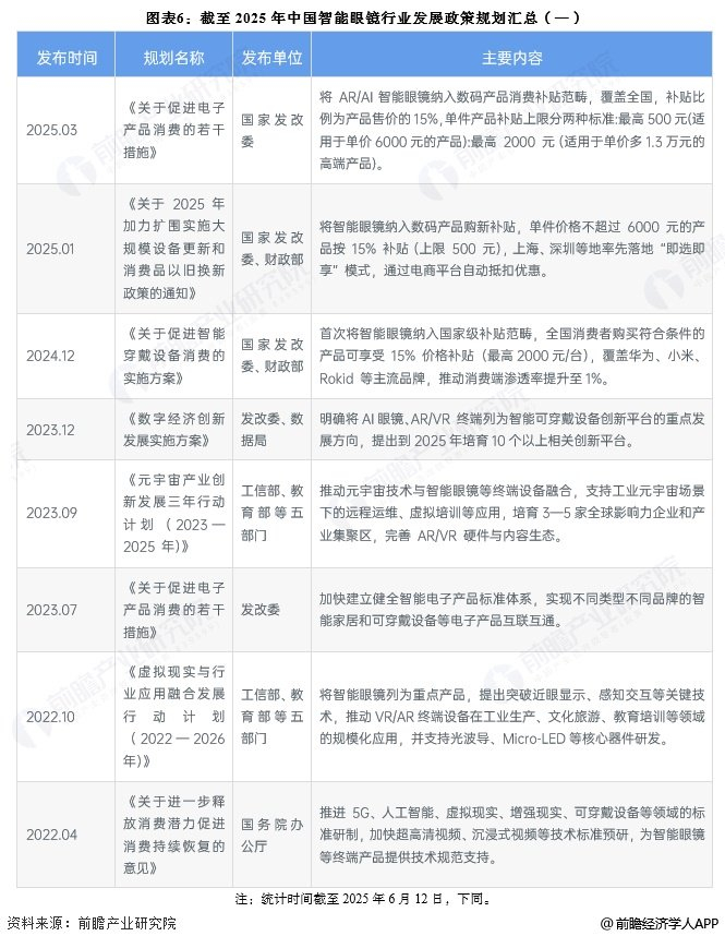 国家出台了一系列支持智能眼镜产业发展的政策,例如《2025年加力扩围实施大规模设备更新和消费品以旧换新政策》,对于购买智能眼镜产品按产品销售价格的15%提供补贴,《虚拟现实与行业应用融合发展行动计划(2022—2026年)》则提出要推动智能眼镜产业与其他行业的深度融合,拓展应用市场。具体政策规划汇总分析如下:
