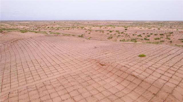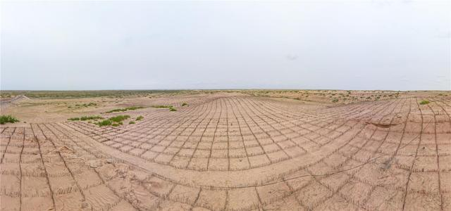沙丘铺满沙障。
