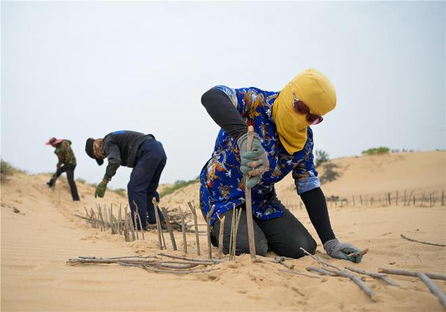 6月26日,锡林郭勒盟正镶白旗的农牧民在浑善达克沙地中制作沙障。锡林郭勒盟正镶白旗地处浑善达克沙地腹地,境内沙化面积470万亩。