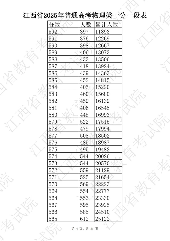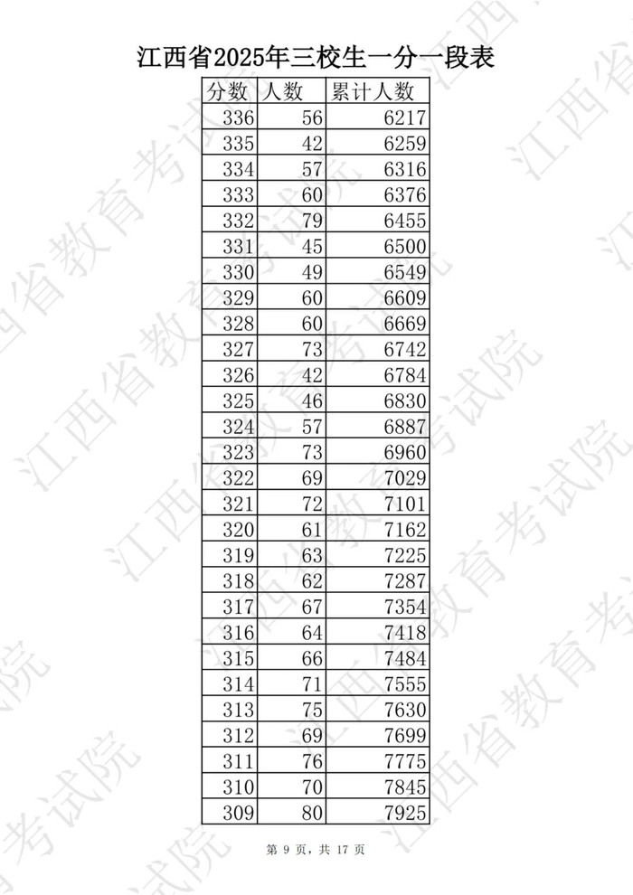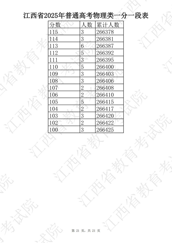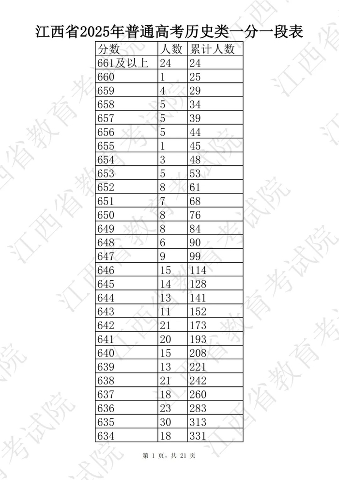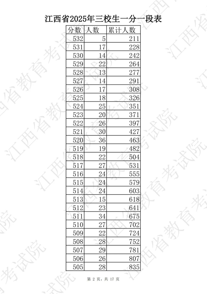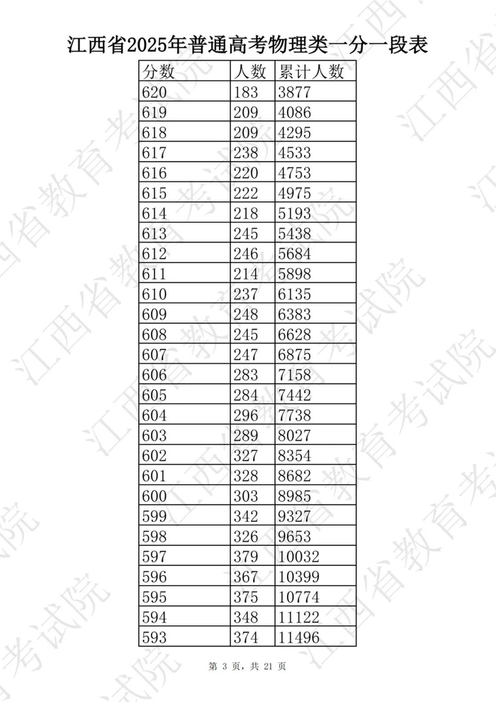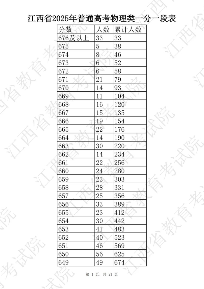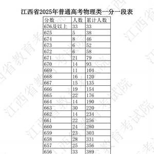江西省2025普通高考一分一段表公布