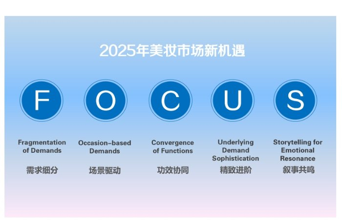 有需求的地方永远有生意。竞争激烈但增长乏力的市场,需要的是实现差异化突围的能力。“美妆市场2025年的机遇点可以概括为‘FOCUS’。”李嵘在分享中总结了我国美妆市场五大最新趋势。