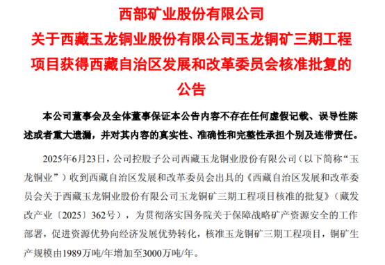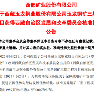 西部矿业6月25日晚公告,公司控股子公司西藏玉龙铜业股份有限公司(简称“玉龙铜业”)收到西藏自治区发展和改革委员会出具的《西藏自治区发展和改革委员会关于西藏玉龙铜业股份有限公司玉龙铜矿三期工程项目核准的批复》(藏发改产业〔2025〕362号),核准玉龙铜矿三期工程项目。