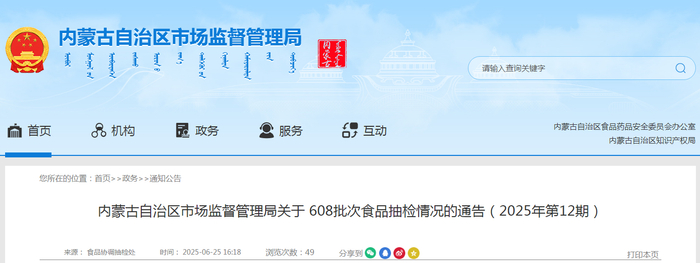 内蒙古自治区市场监督管理局关于608批次食品抽检情况的通告(2025年第12期)