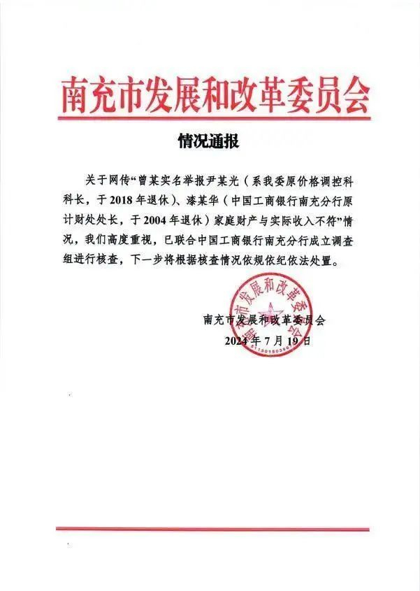 2024年7月19日,针对曾女士的实名举报,南充市发展改革委发布“情况通报”称,曾女士实名举报的尹某光系该委原价格调控科科长,早在2018年就已退休了,妻子漆某华系中国工商银行南充分行原计财处处长,已于2004年退休。