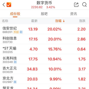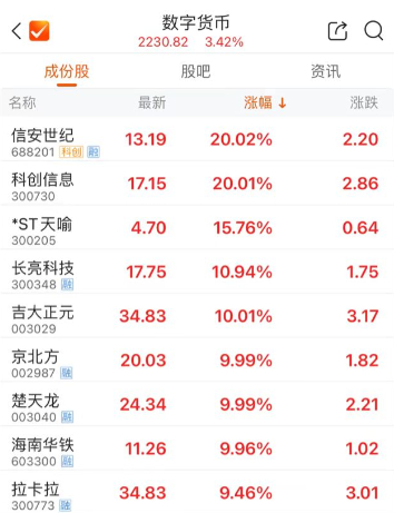 受此消息提振,数字货币概念股大涨。截至发稿,信安世纪、科创信息涨超20%;*ST天喻、长亮科技、吉大正元、拉卡拉等股票表现亮眼。