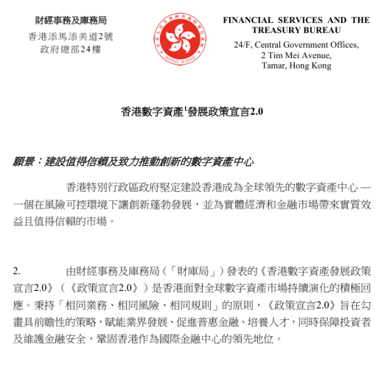 6月26日,香港特别行政区政府正式发表《香港数字资产发展政策宣言2.0》(简称《政策宣言2.0》),重申将香港打造成数字资产领域中的全球创新中心。