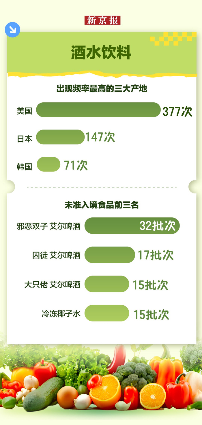 今年是“十四五”收官之年,新京报记者梳理全国未准入境食品信息发现,近年来,我国对输华食品准入管理愈加严格,由海关总署发布的未准入境食品信息批次明显增加,披露信息更加细致。伴随居民生活水平提高和对食品需求的多样化,酒水饮料超过水产品成为2024年未准入境最多的食品类别。啤酒、南美白对虾、牛肉等不合格现象较多,标签不合格、货证不符成为很多食品未准入境的主要原因。