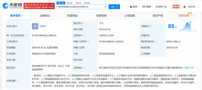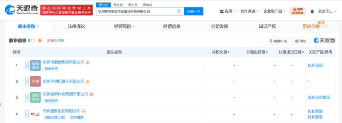 天眼查App显示,近日,杭州具身智能中试基地科技有限公司成立,法定代表人为田树军,注册资本1亿人民币,经营范围含人工智能公共数据平台、人工智能通用应用系统、人工智能双创服务平台、人工智能行业应用系统集成服务、人工智能基础软件开发、数据处理和存储支持服务、智能机器人的研发、互联网数据服务、特殊作业机器人制造等。股东信息显示,该公司由杭州市数据集团有限公司、宇树科技旗下杭州宇树机器人有限公司、传化智联、杭州高新科创集团有限公司共同持股。