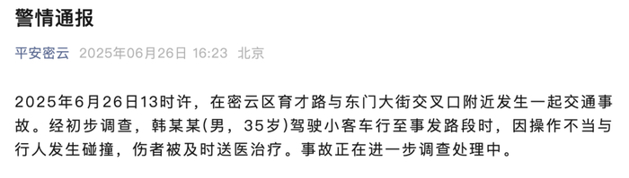 警方通报北京密云一起交通事故:韩某某因操作不当与行人发生碰撞