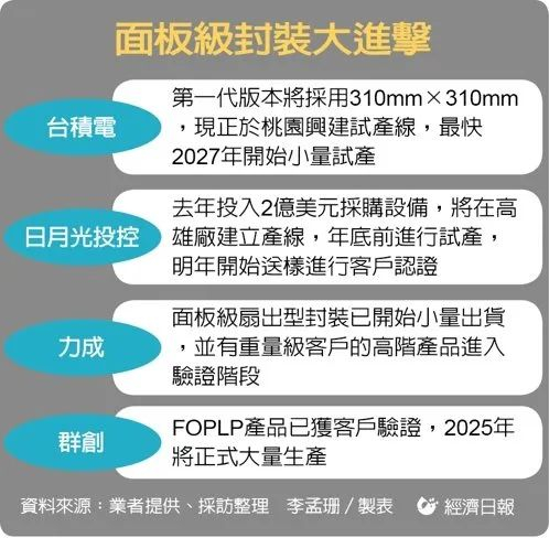 日月光投控在扇出型面板级先进封装布局超过十年,去年投入2亿美元采购设备,将在高雄厂建立产线,预计今年下半年设备进驻,年底前进行试产,明年开始送样进行客户认证,未来日月光集团将在先进封装领域强化竞争力。