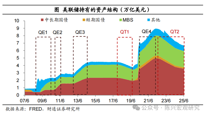 美联储:资产负债表管理,正在缩表减持美债。美联储持有的美债,是通过实施量化宽松政策而来。次贷危机时,美联储购入大量MBS证券进行救济,此后的QE实施过程中均购入大量美债。目前,美联储仍在QT进程中,持续减持美债资产,持有的美国中长期债券已从2022年5月持有的5万亿美元缩减至今年5月的3.6万亿美元。