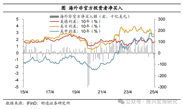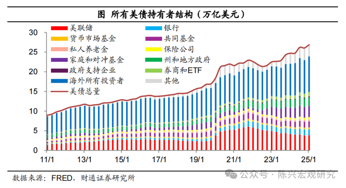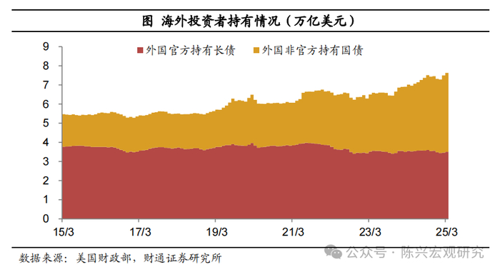 海外非官方投资者增持。2019年以来,海外官方机构对美国债券的持有规模基本维持稳定,但来自国外私人投资者的需求却显著上升。截至2025年一季度,海外私人投资者持有的长期美债已经超过海外官方,为4.1万亿美元。