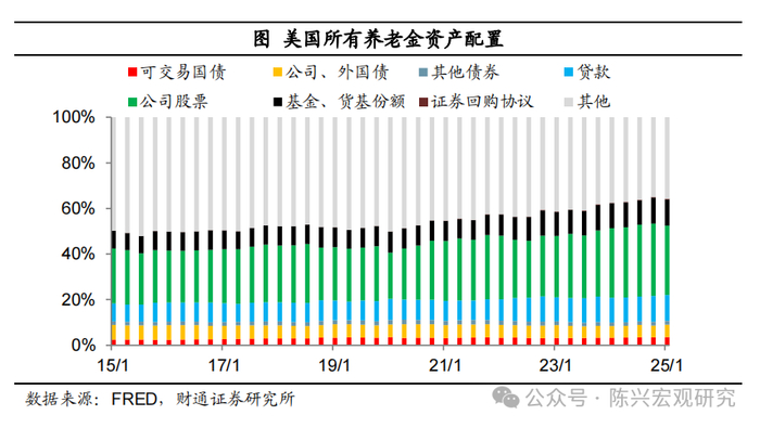 养老金和保险公司:资产负债管理需求。由于养老金、寿险计划具有长期投资期限,往往需要履行未来数十年到期的义务,因此在资产配置上更注重可持续性和韧性,具有多元化的特征。从美国养老金资产配置来看,近一年来,美国可交易国债占比约3.3%,而公司股票、基金和货基、贷款等资产更多,其中公司股票在资产中占比约三成。保险公司的资产配置中,美债持有比例也较低,例如今年一季度寿险公司持有的美国国债仅占总资产的1.8%。