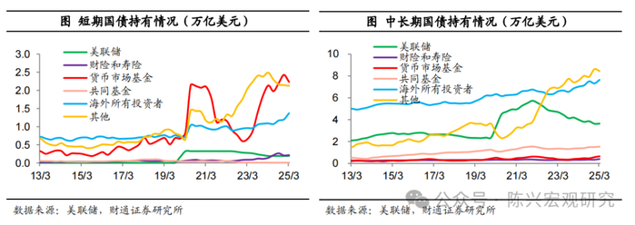 若美国两院通过《美丽大法案》,债务上限或继续向上突破,随着净赤字增加,将在未来十年内继续提升美国债务水平。2024年以来,美国财政部中长期国债净发行量有所提升。是谁持有长期美债?各自基于什么投资逻辑买入?