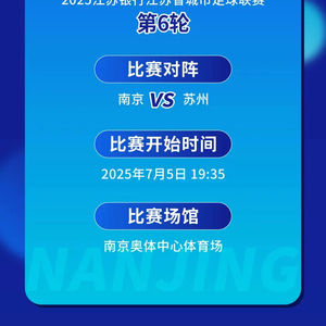 扬子晚报网6月26日讯(记者 张昊 王夕悦)6月26日下午,记者从南京体育产业集团公告了解到:2025江苏省城市足球联赛第6轮,南京队将在南京奥体中心体育场主场对阵苏州队,本场比赛相关票务开票事宜已公告。
