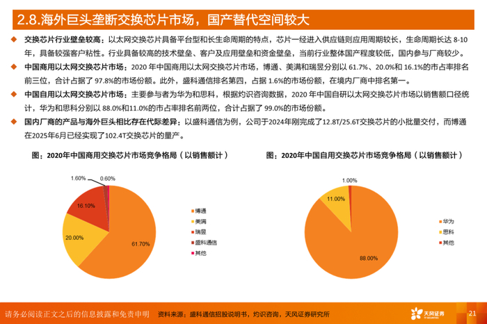 交换芯片为交换机的核心部件,PHY芯片是交换机重要的组成部分。全球以太网交换芯片市场规模持续增长,未来主要规模增量将来自商用厂商;数据中心将成为未来中国商用以太网交换芯片市场增长的主要推动力。交换芯片行业壁垒较高,海外巨头垄断交换芯片市场,国产替代空间较大,国产芯片与海外相比存在代际差异。PHY芯片是以以太网有线传输为主要功能的通信芯片,用以实现不同设备之间的连接。以太网物理层芯片领域集中度较高,欧美和中国台湾厂商拥有较大的领先优势。