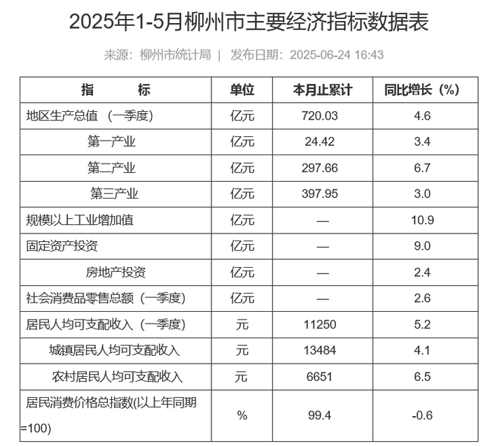 柳州市统计局数据显示,1-5月,全市经济运行总体平稳,延续向好发展态势,工业生产加快增长,服务业运行平稳,消费市场稳定增长,投资、进出口增势较好,民生保障扎实有力。其中1-5月,全市一般公共预算支出160.3亿元,同比下降0.9%。其中,教育、社会保障和就业支出分别增长5.2%、7.7%。