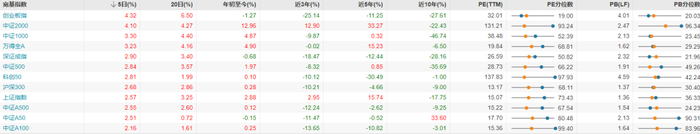 周四各大指数小幅调整,百分位、估值出现小幅下移,可以作为参考因子,当分位点达到高点,可以辅助短期操作进行高抛,当分位点调整至低点,可以辅助短期操作进行低吸。中期可以在低估点位,逐步开始定投。(蓝色当前,黄色是平均)。数据来源:Wind