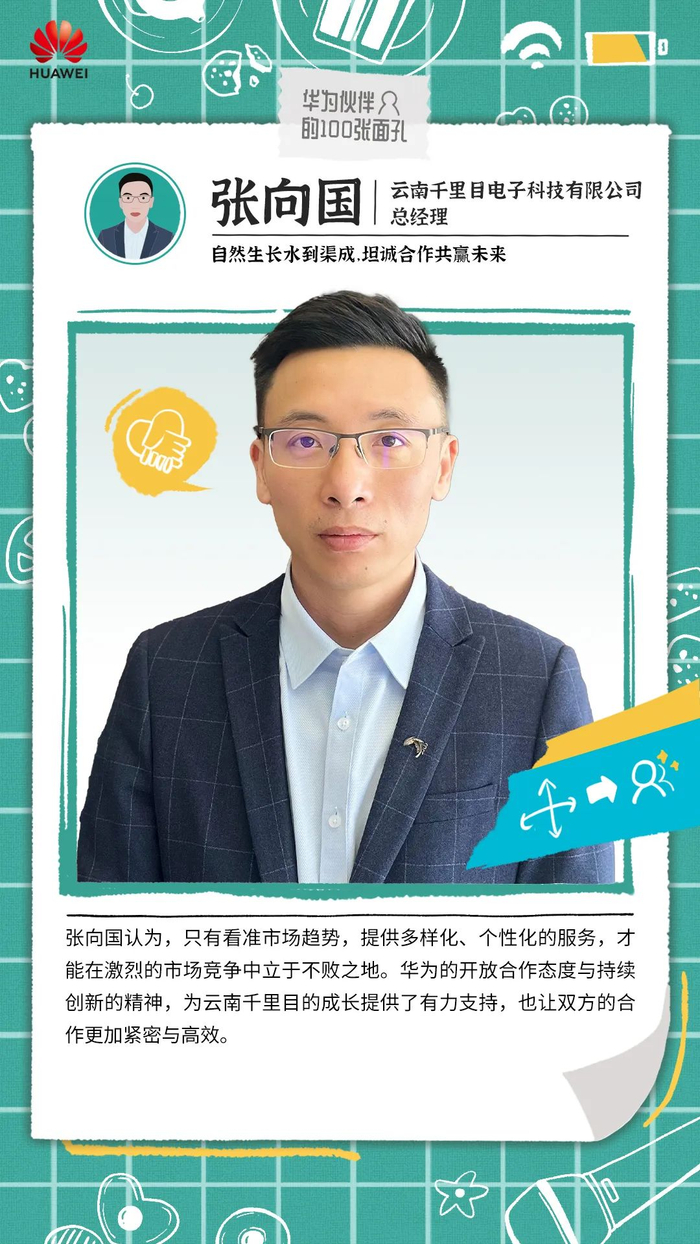 云南千里目的企业文化强调:为客户提供卓越的产品及服务不懈努力,这与华为的合作理念不谋而合。张向国说,“我人生中最重要的一件事,就是陪伴孩子的成长。”每一次家长会、运动会、学校组织活动,每一个孩子成长的瞬间,他都会积极参与,不愿错过。而作为两个孩子的爸爸,他说:“无论是作为家庭的负责人,还是公司的负责人,担起身上的责任非常重要,要勇于担责,勇敢拼搏,这样不仅能够给孩子做好榜样,而且也能够让公司发展越来越好。”