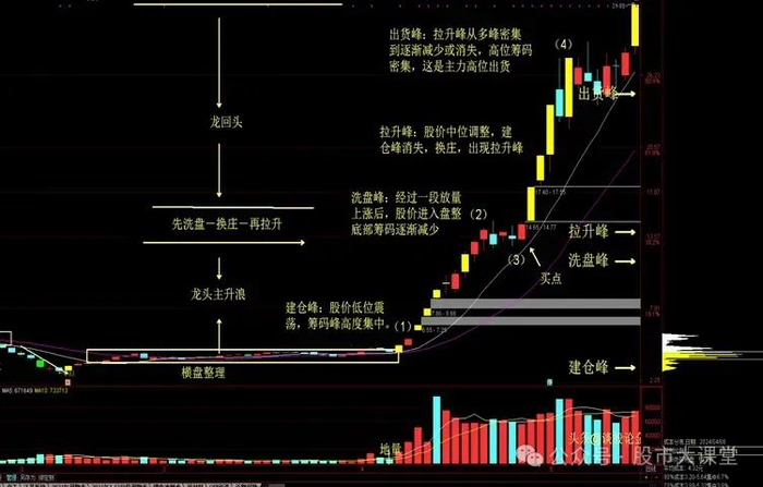 a、股价底部3-6个月横盘调整,底部筹码峰高度集中。放量上涨,拉龙头主升浪。