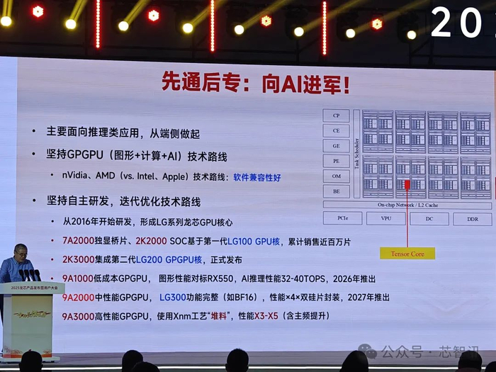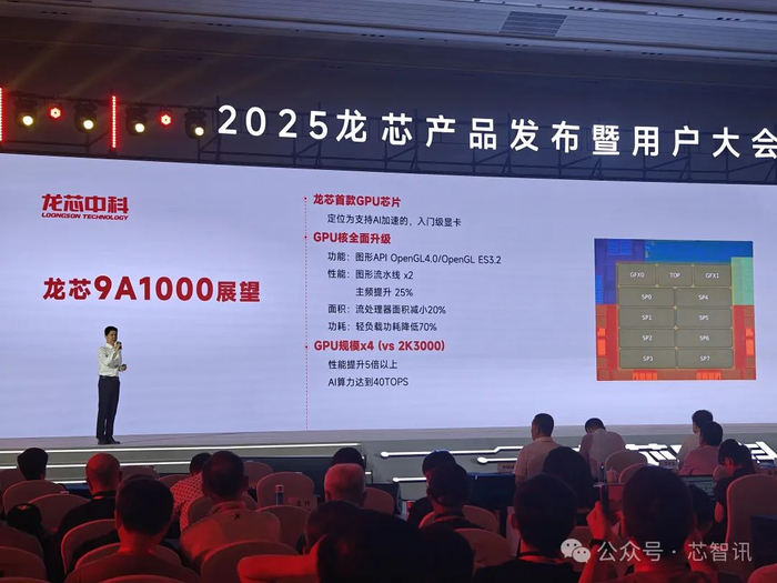 苏孟豪则进一步指出,9A1000相比2K3000集成的第二代GPGPU核心LG200带来了5倍以上的性能提升,AI算力更是达到了40TOPS。这主要得益于9A1000的GPU内核进行了全面升级,图形流水线翻倍,主频也提升了25%,同时流处理器面积减小了20%,轻负载功耗降低了70%。并且,9A1000的GPU规模提高到LG200的4倍。该芯片将会在2026年推出。