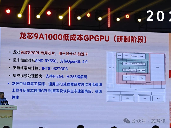 龙芯中科对于9A1000的定位是低成本的GPGPU,这也是龙芯中科首款GPGPU专用芯片,主要面向显卡/AI加速卡。其中,显卡性能对标AMD RX550,支持OpenGL 4.0;在终端AI计算性能方面,INT8性能大于32TOPS。同时,9A1000还将集成视频处理模块,支持H.264/H.265编解码。