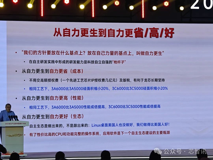 胡伟武指出,经过从2001年以来二十多年的持续努力,龙芯CPU开始从自力更生到自力更省(成本)、自力更生到自力更高(性能)、自力更生到自力更好(生态)的转变。