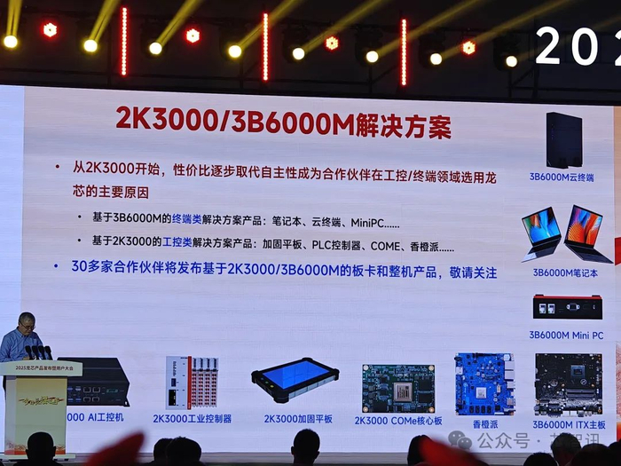 在此次发布会上,华龙讯达、盛博科技、道莅智远科技、众达科技、米联客、湖南兴天、国科亿道、北方星空、航宇创通、航力安太、新松佳和、眺望电子、嘉擎信息、中嵌科技、上海宽域、中科云、中邦自控、吉斯凯达、赛飞特、上海合亿、瑞腾信息、国科鸿飞、研域、迅龙软件、艾宝科技、升腾、航天龙梦、卓怡恒通、创智成、六联智能、宝新创、智微智能、高能计算机、麒麟信安、艾讯云等35家企业现场发布了基于龙芯2K3000/3B6000M处理器的板卡、工业控制器、工控一体机、工业平板、笔记本、云终端等工控及终端产品,具有高性能、高可靠、强安全等特点,适用于复杂工业环境、推理场景,可广泛应用于能源、交通、制造等领域,守护能源安全、助力交通智行、赋能新型工业化。