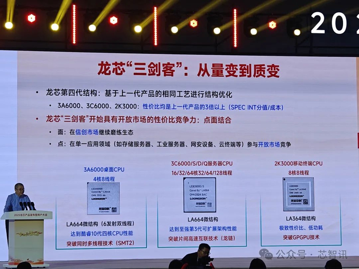 胡伟武在发布会上宣布:“以龙芯3A6000、龙芯3C6000、龙芯2K3000为代表的龙芯‘三剑客’性价比是龙芯上一代产品的3倍以上,具有开放市场的性价比竞争力。”