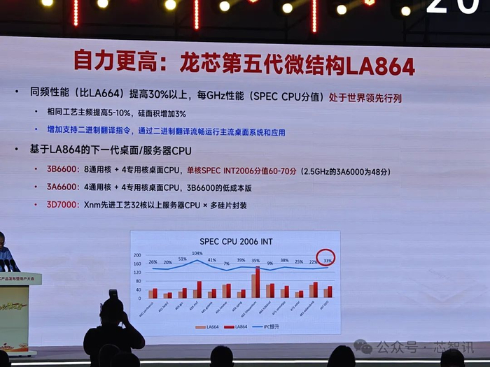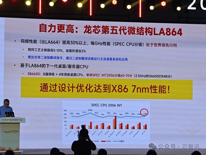 据胡伟武介绍,龙芯接下来的第五代微架构LA864相比上代的LA664在同样主频下,性能可以提升30%以上,每GHz性能(SPEC CPU分值)处于世界领先地位。虽然LA864的硅片面积比上代增加了3%,但是相同工艺下主频提高了5-10%,并且还增加对于二进制翻译指令的支持,通过二进制翻译可流畅运行主流桌面应用。