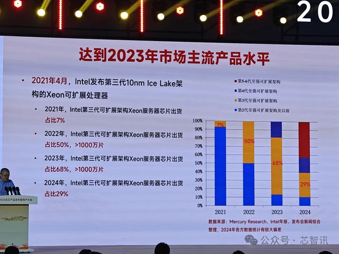 龙芯中科董事长胡伟武表示,结合英特尔公司第三代至强可扩展架构服务器芯片出货情况,龙芯3C6000系列服务器CPU综合性能达到2023年市场主流产品水平(2023年第三代至强的出货占比仍高达68%),产品代差缩小至两代。