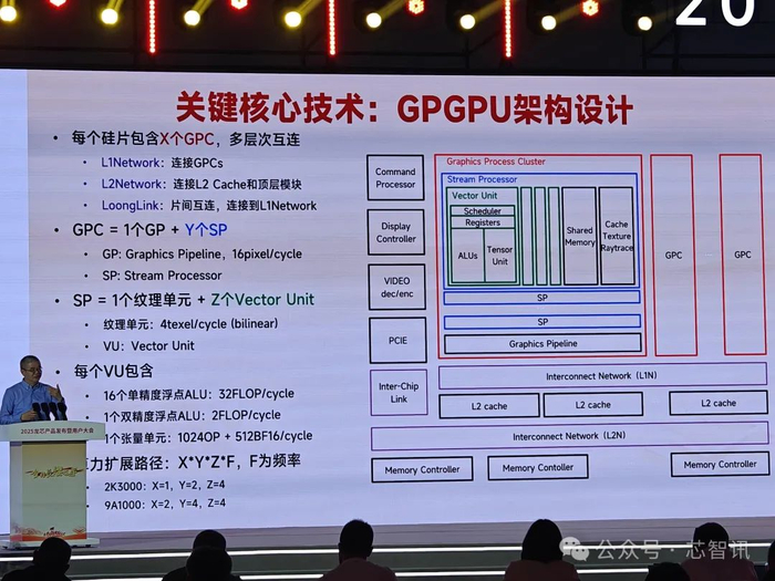 根据胡伟武的披露的龙芯中科GPGPU架构资料显示,其每个GPGPU硅片当中包含了X个GPC计算单元,通过多层次互联;每个GPC当中则将集成1个GP单元(Graphics Pipeline, 16pixel cycle)+ Y个SP单元(Stream Processor);每个SP单元当中又包括1个纹理单元+Z个Vector Unit;每个Vector Unit当中则包含了16个单季度浮点ALU(32FLOP/cycle)、1个双精度浮点ALU(2FLOP/cycle)、1个张量单元(1024OP+512BF16/cycle)。因此,整个GPGPU的算力扩展路径就是X*Y*Z*F(F为频率)。此次发布的2K3000集成了1个GPC计算单元,2个SP单元,每个SP单元当中包含了4个Vector Unit。