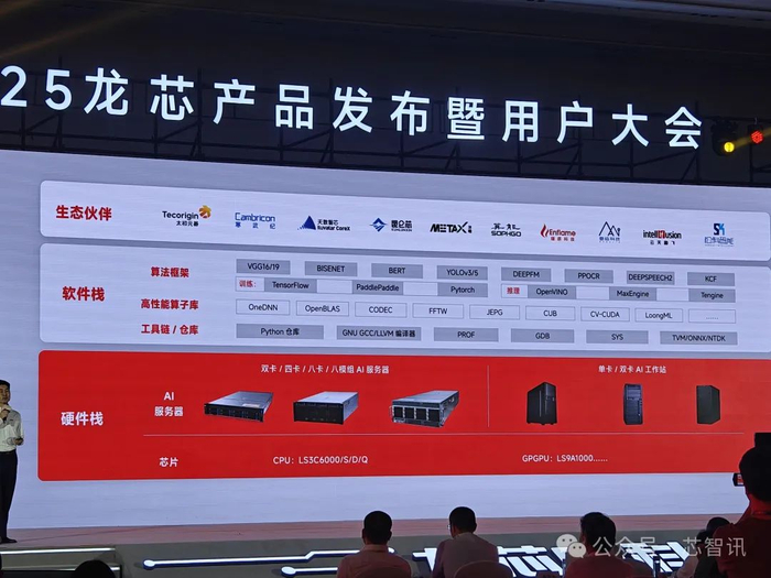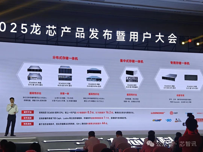 在本次发布会上,浪潮计算机、中兴通讯、联想开天、软通计算机、航天706所、超越科技、超云、诚迈科技、云尖、国鑫、国光、宝德、网安、207所、中核华辉、升腾、大唐科研总院、太初元碁、华清同创、航天龙梦、联硕、黄河信产、航天联诚、天融信、上海宽域、雷神、腾凌科技、鲸鲨软件、百代存储、上海芮宣、铵泰克、众达科技、湖南兴天、深圳芯创、原基科技、湖南博匠、万数科技、储迹、恒生数字、北联国芯、攀升科技、派能信创、通明智云、国建大数据、擎毅科技、天安星控、中博数智、天创者、云晓科技等48家企业发布了基于龙芯3C6000系列处理器的通用服务器、存储服务器、工业服务器、网络安全设备等主板、整机及解决方案产品,在党政、国防、金融、能源、电信、云计算、AI等关键领域具有广阔应用前景,其中部分主板和整机强调核心元器件100%国产化。
