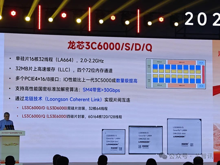 本次大会发布的龙芯3C6000系列服务器CPU采用自主指令系统龙架构,于2024年上半年流片成功。3C6000单硅片16核32线程,可通过自研的龙链接口通过多硅片封装形成32核64线程的3C6000/D(又称3D6000)及60/64核120/128线程的3C6000/Q(又称3E6000)。