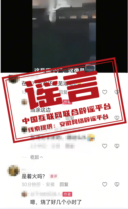 真相:近日,一网民在短视频平台发布视频配文“这是哪个厂,好像是着火啦”,并在评论区称“工厂在当涂、烧了好几个小时”等。经安徽省马鞍山市当涂经济开发区应急管理局和消防救援中心核实,当涂经济开发区境内没有发生火情火灾,该视频为虚假信息。(来源:“安徽省互联网违法和不良信息举报”微信公众号)